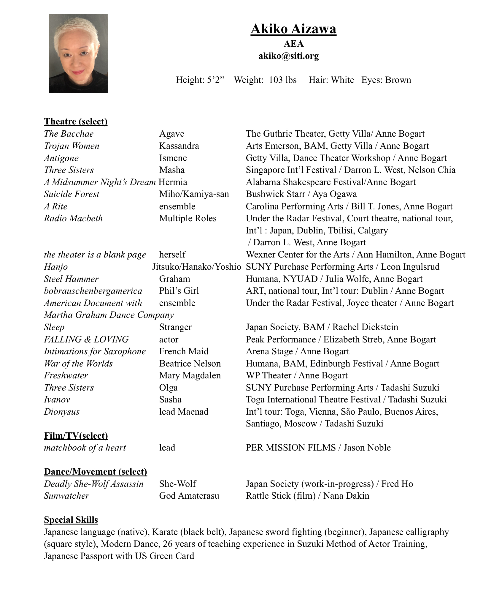 Akiko Aizawa joined SITI in 1997 and has appeared in 30 shows including The Bacchae (BAM, Guthrie), A Rite (with Bill T. Jones/Arnie Zane Co.), Falling & Loving (with STREB Extreme Action), Steel Hammer (music by Julia Wolfe), American Document (with Martha Graham Dance Co.), the theater is a blank page (with Ann Hamilton), Trojan Women (Getty Villa), bobrauschenberg-america (American Repertory Theatre), Radio Macbeth (Public Theater) and Culture of Desire (NYTW), all directed by Anne Bogart; and Hanjo (Japan Society), directed by Leon Ingulsrud. Other credits: Suicide Forest (dir. Aya Ogawa), Sleep (dir. Rachel Dickstein); The Trojan Women, Three Sisters, Dionysus, The Bacchae, The Chronicle of Macbeth, Ivanov, Waiting for Romeo and Greetings from the Edge of the Earth (as a member of SCOT 1987-1993, dir. Tadashi Suzuki). Akiko has been teaching Suzuki Method of Actor Training for 25 years. She is originally from Akita, Japan.